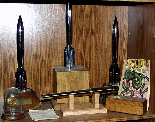 § Gallery![]() At home at Arrowhead, Milford, Pennsylvania in the 1950's. This is the west side of the home; the front door is to your right (his left), and the windows face Harford street. You see that quart of beer? He loved his beer. ![]() On his Vespa scooter, in Manhattan, New York in the 1960's. He used it to commute between Milford, PA, and Manhattan where he was employed. ![]() His three Hugo awards, the telescope is for his induction into the SF hall of fame, the Astounding contains his first published words, the paper is his original subscription order for Astounding, and the watch is with his Phi Beta Kappa key. ![]() His gravestone at Oxford, in the United Kingdom. It isn't carved very deeply, and even with contrast forcing, this is the best photo we've found such that you have any chance of reading the inscription. Recent looks at the stone reveal considerable aging, and even less legibility. In case you can't make it out, it says: 1921-1975 AUTHOR